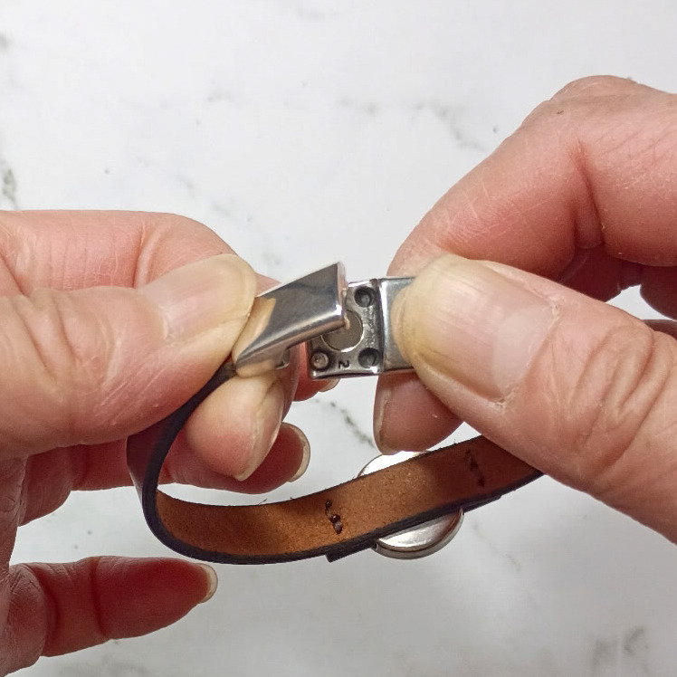 Tip to Close and Open the Magnetic Clasp: Magnetic clasps are very secure and easy to use. However, the first time a person tries to open a magnetic clasp, they may find it tricky. Hold the bottom part of the clasp still, and lift the top of the clasp off at an angle. It is a twisting motion and not a direct pull upward. The two halves of the magnetic clasp do not “pull apart”. Do not grab the ends of the leather and yank, or you may break the bracelet.